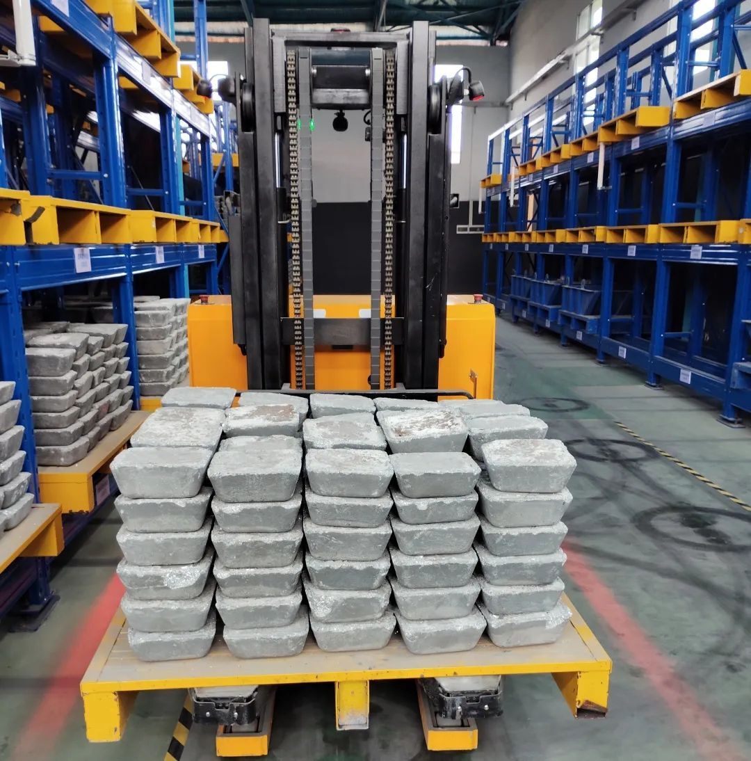 AGV叉車正在轉(zhuǎn)運銻錠